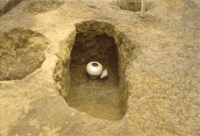 | 養老川沖積地と海岸平野を展望する台地上にあります。発掘調査の結果、弥生時代から平安時代までの複合遺跡であることが確認されました。奈良・平安時代の遺構は土壙墓1基、地下式改葬墓1基があり、墓域だったことがわかります。地下式改葬墓は南側斜面からスロープ状の入口施設を設けられ、玄室部分の天井は崩落していましたが床一面に木炭が敷きつめられ、その上から猿投産の灰釉短頸壺と灰釉椀が発見されています。壺は蔵骨器、椀はその蓋として壙内に安置されたものです。 『千葉県の歴史』資料編 考古3 (財)千葉県史料研究財団 1998年 |
