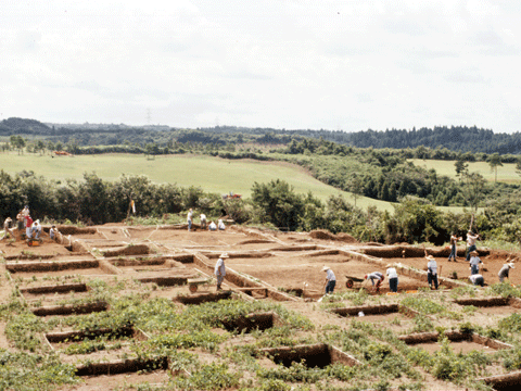 | 遺跡は袖ケ浦市に近い上高根の、標高90m前後の台地上にあります。養老川の左岸にあたりますが、小櫃川水系の支谷にも面しています。1964年と1976年に発掘調査が行われ、1976年の調査では、基壇のある掘立柱建物跡2棟、掘立柱建物跡3棟以上、瓦塔基壇1、竪穴住居跡22棟、製鉄遺構5ヶ所などが検出されました。 出土遺物には、瓦塔(組み立て式の焼き物の塔)や青銅製の匙、「寺」・「佛(ほとけ)」などの墨書土器多数、瓦などがあります。特殊な遺構と遺物があることから、遺跡は、古代の集落の中にある寺院だと考えられます。 |