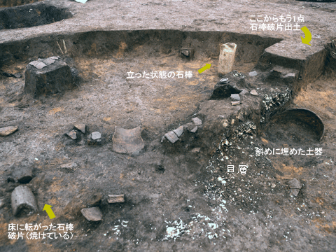 縄文中期後葉の住居跡から3点の大形石棒が出土しました。石棒のうち1点は出入口付近の穴に突き刺さして立ててありました。他は破片で、表面が焼けていました。大形石棒は立てた状態で使い、火を使う儀式を行うことがあったようです。最後にはわざと壊したようです。くわしいことは、これから行う整理作業で明らかになることでしょう。縄文人の祈りのすがたをうかがうことができるよい資料です。