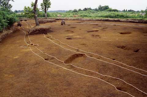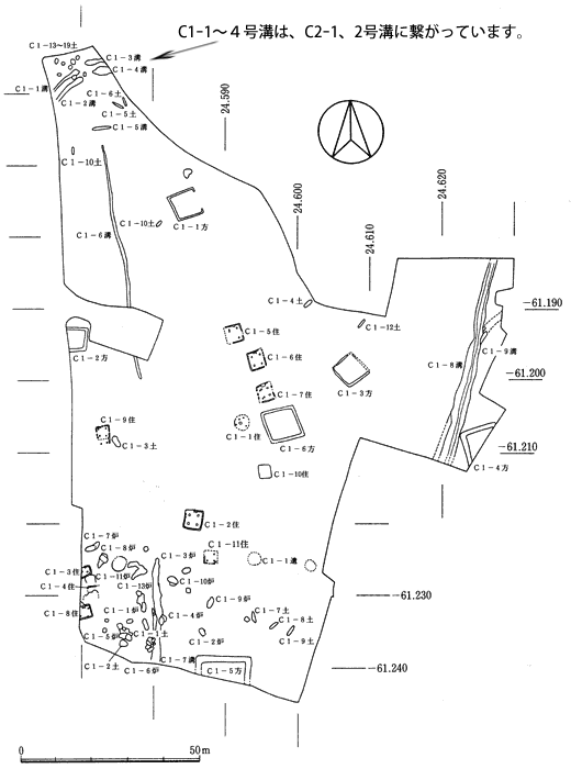 | さらに、この中央部付近を南北に通過するC1-6・7号溝は底部が堅く踏み固められており(中央部付近では認められていませんが)道路と推定されます。 この集落の中心を南北方向に道路が通っていたようです。 そして、この溝の集落を過ぎた北端部分は途切れ、数メートル先には溝を遮るように直行する長さ4.85mの長円形で深さ30cm弱の溝(C1-5号溝)が存在します。 これは土塁や塀などの目隠し用施設跡の可能性があります。 また、この集落は、さらに幅4 〜5mの二重の溝に囲まれていました(C1-1から4、C2-1、2号溝)。 溝の間(幅約2m弱)は溝を掘った土で土塁状に盛り上げていた可能性もあります。 この二重の溝は、目隠し用施設跡とみられるC1-5号溝の北側で途切れ、幅約3mのブリッジ状になっています。 集落への北側からの出入口が有ったのでしょうか。 調査は一部分ですが二重の溝がこの集落を囲んでいると想定すると囲まれた集落の形は不整円形で広さは約50,000平方メートルにもなります。つまり、溝などによって周囲と区画し遮断する施設をもった集落といえます。 |
