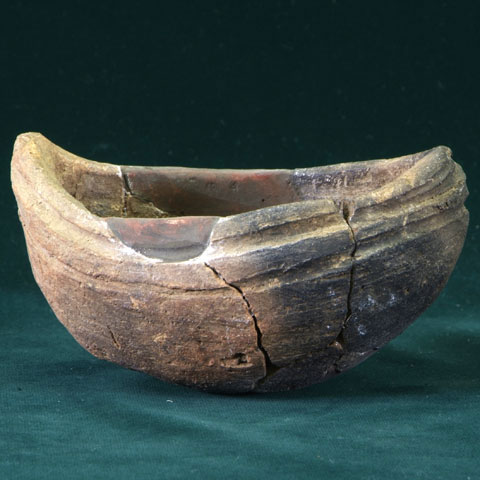 解説:上面観が楕円となる丸底の土器で、長軸方向の口縁部がやや尖るつくりとなり、いわゆる舟形を呈するものである。