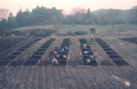グリッドと呼ばれるマス目ごとに発掘している。表土から全て手掘りの作業。現在は重機を使うのが当たり前であるから、今では考えられない光景だ。
