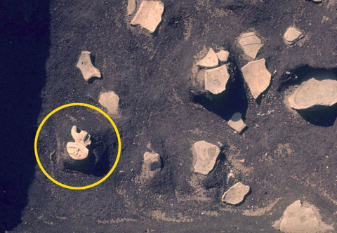 1次調査では、貝塚の中央部から土偶や石棒などまつりの道具がたくさんみつかった。