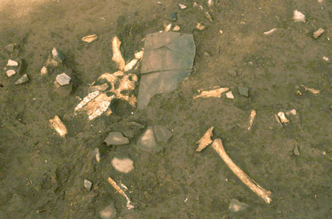 1次調査では、貝塚の中央部から土器などとともに、たくさんの獣骨がみつかった。イノシシやシカのもので、その量は「骨塚」と呼ぶほどだった。縄文晩期の特殊な事例として当時注目を浴びた。
