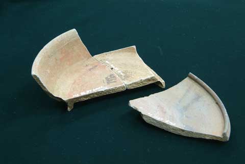 朱墨硯として再利用された破片も混じっていた。器面に赤く見えるのが朱墨の跡。 |