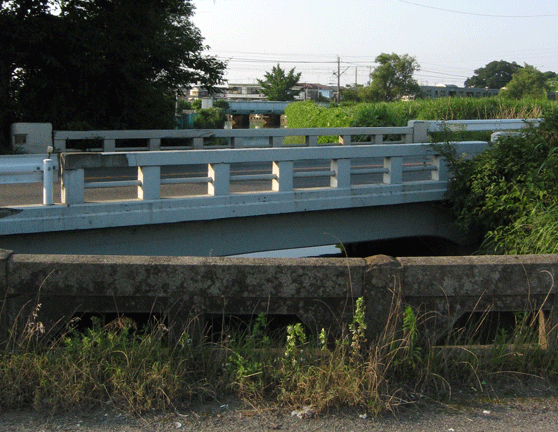 8-1(下)中央を流れる今津川は、古代養老川のなごりと考えられています。写真に見える3本の橋梁は、奥からJR内房線鉄橋、旧国道の「白塚境橋」、そして房総往還・古代メインルートの「白塚橋」です。 |