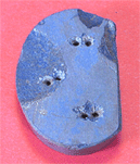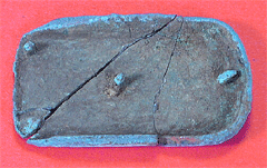 出土地:片又木遺跡(かたまたぎ) 遺跡所在地:不入斗(いりやまず) 遺構: 時代:9世紀前葉〜中葉 解説:古代小鍛冶工房跡から発見されました。左から「絞具かこ」・「丸鞆まるとも」・「鉈尾だび」で、丸鞆以外は銅製品です。本遺跡では銅製品の鋳造痕跡は発見されていませんので、工房製品ではなく、他から持ち込まれた可能性が高いと思います。この3点はそれぞれサイズが異なるため、同一の帯に装着できるものではありません。あるいは帯としてではなく、装飾そのものが威信財的なセットとして所有されていたのかもしれません。これらの所有者は工人集団そのものか、これを統括した官人、あるいは在地有力者か、興味は尽きません。 なお、この工房跡からは、一定量の鉄滓類や鞴羽口、金属製品、多量の「天」銘線刻土器なども出土しています。 |