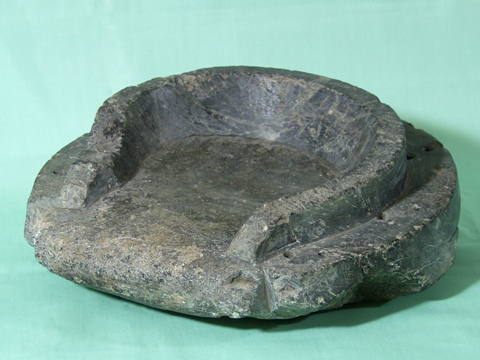 出土地:柏原(かしわばら)地区伝来 時 代:古墳時代中期(5世紀) 解 説:この石枕は、市内柏原小出氏の旧宅地の庭に放置されていたもので、いつ頃、何処で出土したのか詳しいことは解っていません。しかし、小出家は江戸時代から代々名主を務めていた家柄で、この石枕も小出家が所有していた柏原地区の地から出土した可能性が強いと考えられます。小出氏宅の南西1.2Kmには、墳丘全長110mを測る姉崎二子塚古墳が所在し、直弧文石枕(重要文化財)が出土しています。 石枕は、死者の埋葬時に頭部を載せ使用されたもので、比較的大型の限られた古墳から出土する例が多く、特別な意味があったことが想像できます。市内からの出土例は、二子塚古墳・伝椎津稲荷山古墳・柏原地区伝来の3例を数えるのみです。 本例は、全体に円形を呈し、長さ24.5cm・幅27cm・高さ9.5cmで高縁1段を有し、立花受孔が二孔一対で7対ヶ所の計14孔が穿たれています。 |