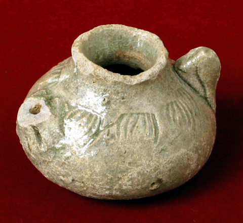 出土地:小鳥向遺跡(ことりむかい) 遺跡所在地:新堀(にいほり) 遺構:方形竪穴遺構 時代:13世紀末〜14世紀初頭 解説:古瀬戸中期様式I期の水滴で、文房具として使われました。 肩に印花文を巡らし、灰釉を刷毛塗りしています。底部はロクロから糸切りに失敗し、穴があいてしまったので、粘土板で塞いでいます。 この陶器は、方形竪穴遺構から出土したものです。ただし伝世の可能性もあるので、遺構の時期は現状で判断しかねます。床下に置いた状態で埋め戻しており、この種の遺構の性質を考える上でも有効な資料です。 |