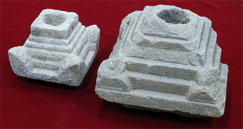解説:「宝篋印塔」という供養塔の笠の部分で、伊豆石と呼ばれる安山岩で造られた中型塔と小型塔です。溝の覆土上面にいっしょに投棄されていました。