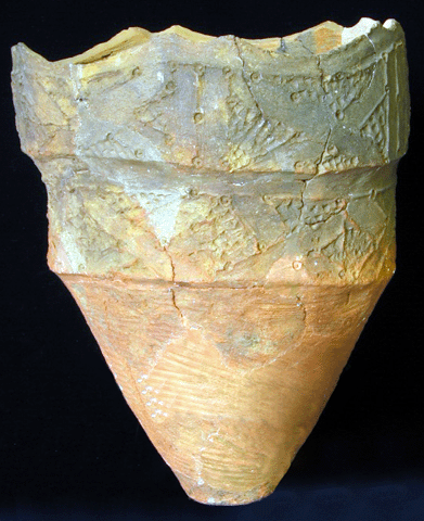 出土地:諏訪台遺跡(すわだい) 遺跡所在地:国分寺台地区・村上(むらかみ) 遺構:炉穴か 時代:縄文時代早期 解説:古墳の周溝覆土から出土したものですが、周囲に縄文早期の炉穴群があったため、これに伴うものと考えられます。 口縁部径23cm、器高28.4cm、底径6cmで、胎土に繊維を含み、褐色〜橙色をしています。口縁部は、2個一組からなる4単位の波状口縁となり、口唇部には刻みが施されています。口縁から胴部中位に段をもうけ、下段はややくびれています。段によって区画された2段構成の文様帯があり、三角文・菱形の文様区画内を刺突文で充填し、文様区画は、微隆起線文によって行われ、その交点に円形の刺突文が見られます。また、文様単位の間は、ナデによる太い無文帯を設け、文様区画以外の胴部から底部にかけてと内面部には、横位の条痕が施されています。 |
