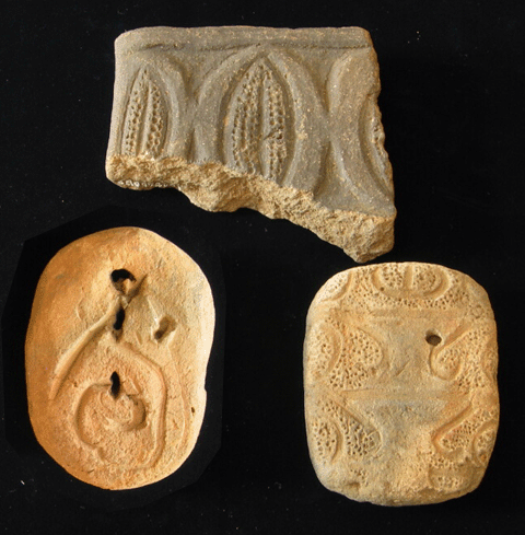 出土地:西広貝塚(さいひろかいづか) 遺跡所在地:国分寺台・西広(こくぶんじだい・さいひろ) 時代:縄文時代晩期 解説:亀ヶ岡文化の中心のひとつである馬淵川(まべちがわ)流域(青森県・岩手県)で,縄文時代晩期初頭に作られ始めた「岩版(がんばん)」にルーツがあります。比較的柔らかくて加工しやすい凝灰岩(ぎょうかいがん)などの扁平で白い礫に彫刻を加えて作られています。同じ時期に作られ始めた岩偶(がんぐう)が他の地域に広がらなかったのとは対照的に,岩版のほうは,その後,土器と同じように粘土を焼いて作った土版とともに東北から関東にまで分布を広げていきました。関東ではもっぱら土版が作られました。形状は扁平で,楕円形〜隅丸長方形が基本です。文様はかなりバラエティに富んでいます。顔の付くものや,女性の体をかたどったものもあれば,幾何学的な文様だけのものもあります。また,吊り下げられるような孔をもつものもあります。祈りの道具と考えられますが,具体的な使用方法やどのような祈りがこめられたのかについては,研究が進んでいません。 西広貝塚からは数十点出土しています。写真上と右下は,左右対称のデザインがみられ,裏面にはまた違うデザインが使われた一番多く見られるタイプです。左下のものはやや異質です。粗い渦巻文が描かれた表面には3つの孔があり,上の孔は中心から下端につながっています。中央と下の孔はそれぞれ裏面に貫通しています。 |