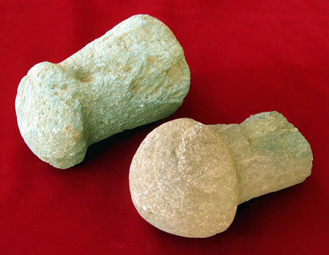 解説:男性器のような造り出しがある有頭大型石棒で、お祭りや信仰などの宗教的な用途が考えられていますが、詳しいことは解りません。写真の遺物は緑泥片岩で造られています。